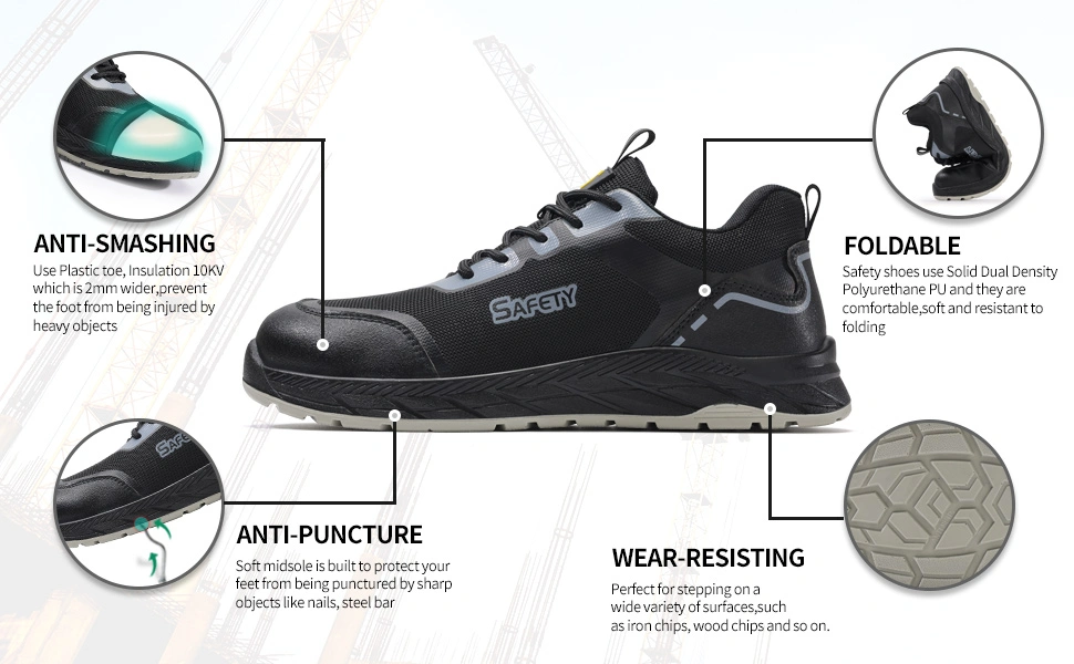 New black casual series ultra - fiber steel wire cloth solid double - density polyurethane PU qualified plastic toe cap anti - smashing anti - piercing insulated 10KV all - season safety shoes