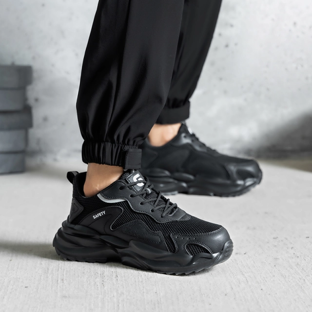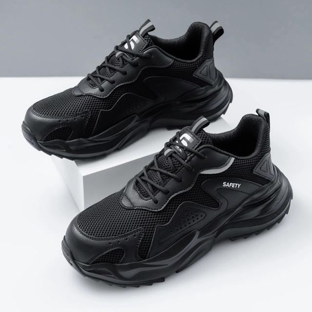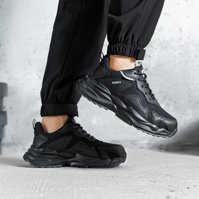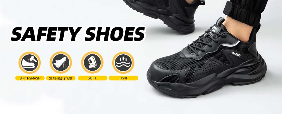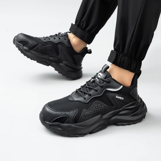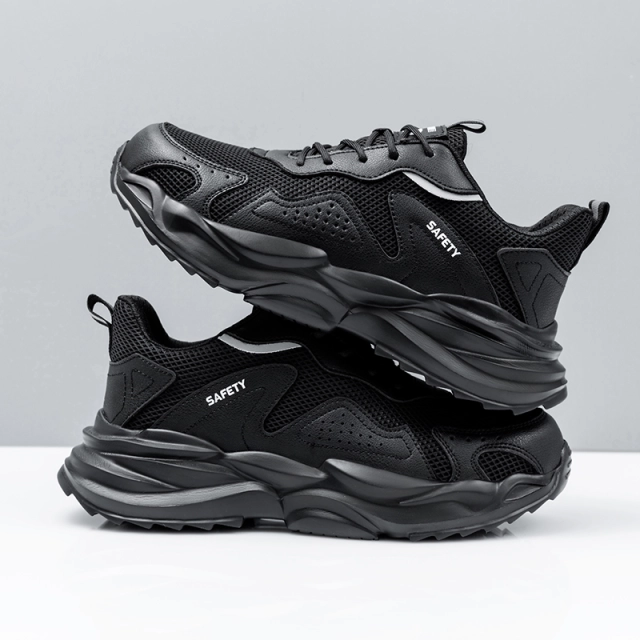 Sports series new black fly - woven mesh fabric anti - smashing anti - piercing European standard steel toe cap Kevlar sole rubber - plastic sole safety shoes