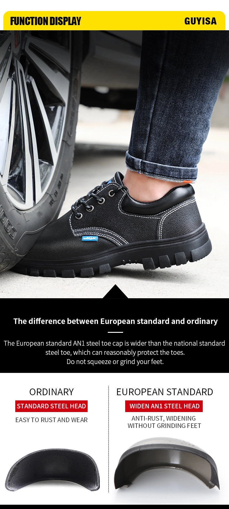 We are professional work safety shoes manufacturer, our work shoes brand is GUYISA. Our company produces a wide range of styles of safety shoes and performance shoes. My factory is in Weifang, Shandong. The company has a strong ability to produce shoes. It can produce about 5,000 to 10,000 pairs of shoes a day. The company has professional design and development personnel and quality inspectors. The products have passed CE and ASTM certifications in terms of quality and style, and are very popular in the international market. We accept customization of shoes and trademark brands, if you want to know more, you can contact our customer service to learn more.