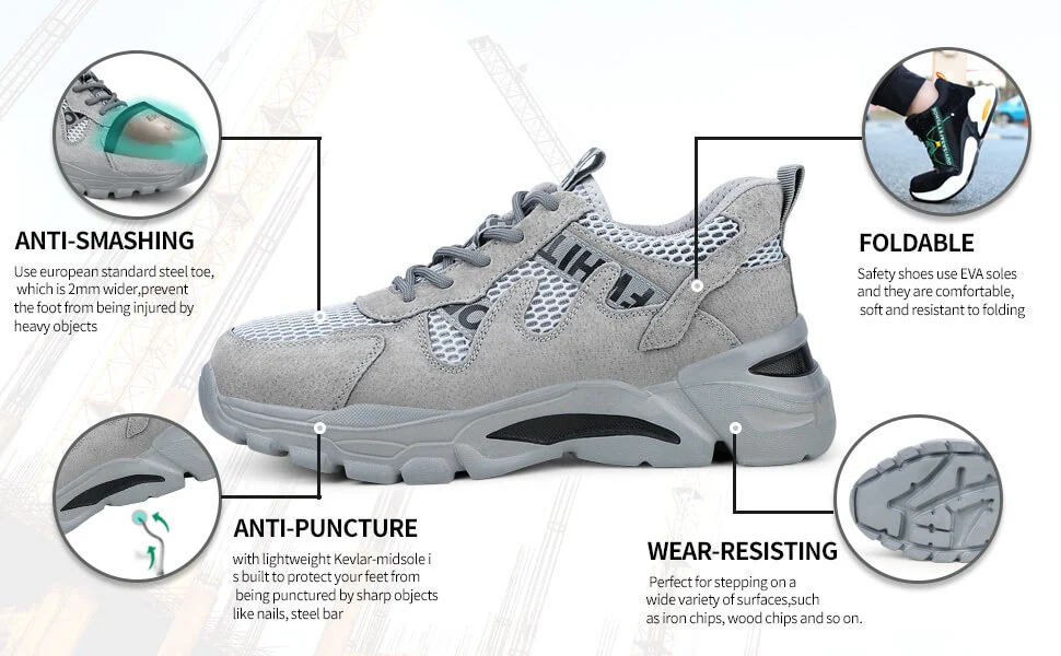 1. The safety shoes are suitable for buildings, factories, mountaineering and other environments. The characteristics of shoes are anti smashing and anti piercing.